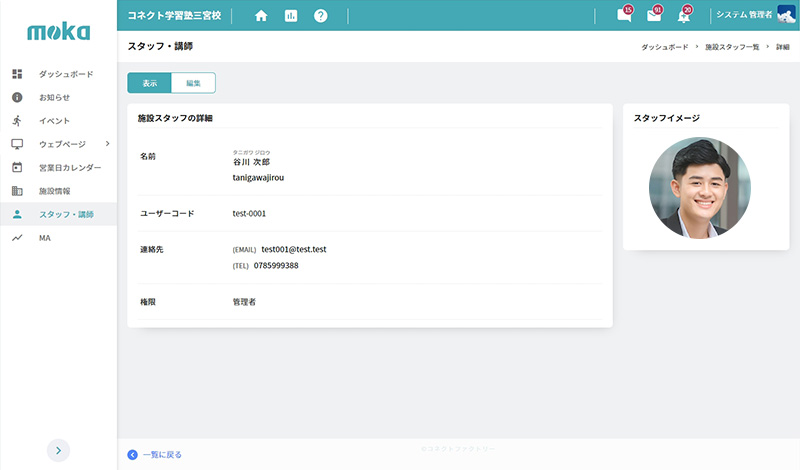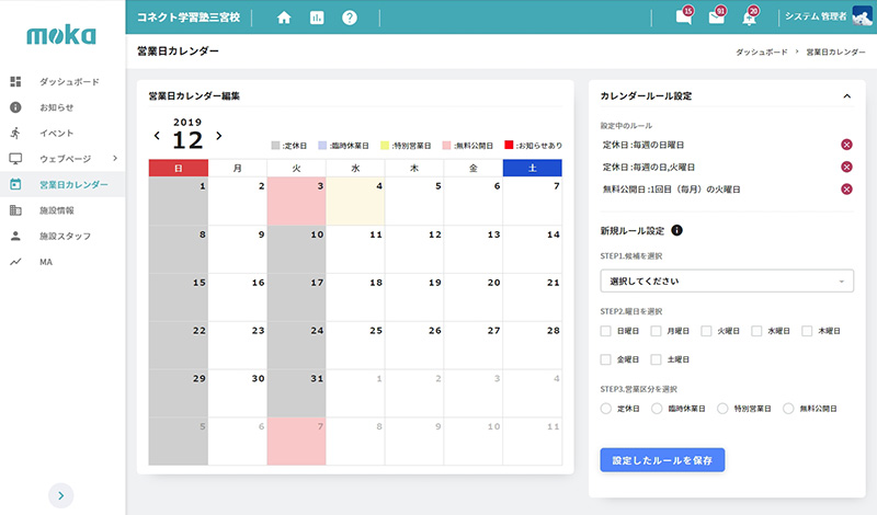 住所やカリキュラムなどを管理画面に登録、スケジュール、施設の写真なども設定できます。